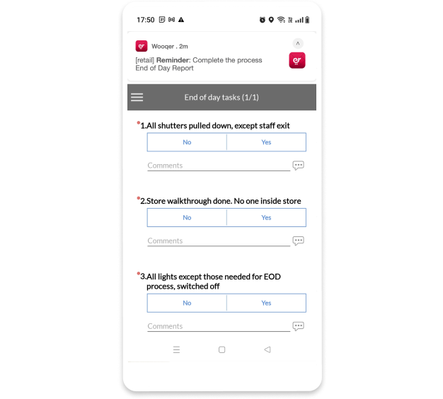 The Wooqer End of Day Report replaces chaos with clarity—standardizing, tracking, and verifying every closing task. It also provides an opportunity to bring all EOD reporting into a single End of Day report. If different people need to send them in, there’s always an option to have independent or partly integrated Cash Credit Reconciliation, Manual Bill reporting, Daily Sales Report and the Store Closing Checklist.